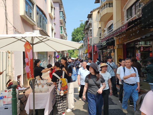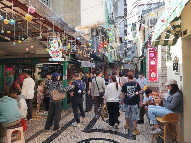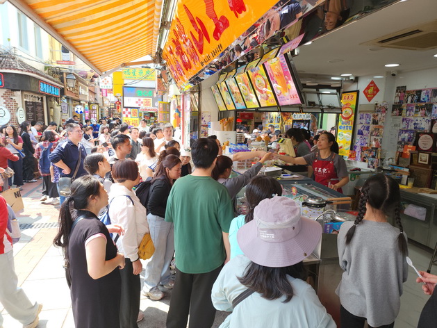 另外,氹仔舊城區行人專用區以至官也街一帶人流同樣暢旺,除了官也街多間小食外賣店排起長長人龍外,多間在行人專用區範圍的食肆在飯市時段都出現排隊情況,由於平日的馬路已作為行人專用區禁止車輛通行,到來的行人除可更舒適地慢遊在舊城區街道外,這些排隊的人龍亦不怕與行人和車輛爭道。