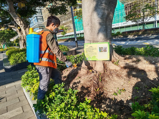 【本報消息】市政署持續巡查及護理各區街道樹木,以維護樹木健康及公眾安全。樹木養護人員經巡查發現觀音像海濱休憩區兩株榕樹感染褐根病,正持續進行救治並已掛上告示牌,讓市民知悉樹木狀況。