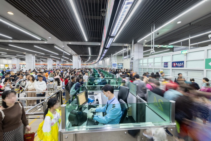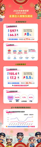 今年內地一連九天春節長假期間(2月15日至23日),全澳出入境總客流量596.7萬人次,日均66.3萬人次通關,較去年春節假期(2025年1月28日至2月4日,共八日)的日均通關人次(61.4萬)增加7.9%;假期期間通關人流峰值出現在年初五,達76.9萬人次。