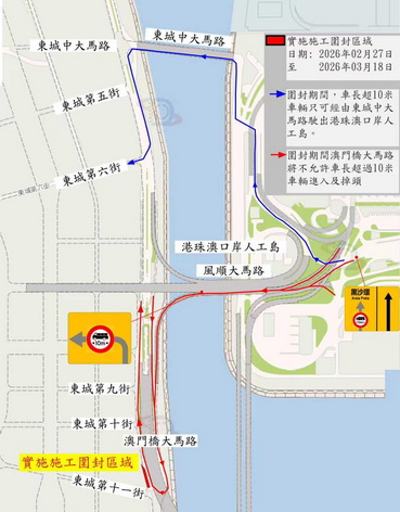 根據相關交通安排,超過10米長之車輛禁止駛入風順大馬路,相關車輛只可經由東城中大馬路駛出港珠澳人工島往A區,敬請駕駛者留意現場指示及禮讓駕駛。