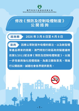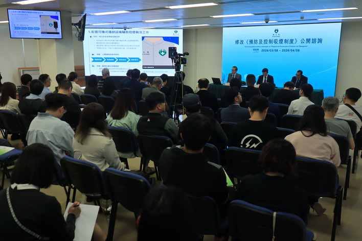 政府周日起就修改第5/2011號法律《預防及控制吸煙制度》進行公開諮詢,諮詢期至四月八日,諮詢首日下午並舉行首場面向工商、旅遊業界的專場諮詢會,衛生局代局長鄭成業致辭時表示,政府透過循序漸進方式逐步擴大禁煙範圍,加強對電子煙規管,並配合煙害宣傳與戒煙服務,相關工作已取得階段性成效。數據顯示本澳整體吸煙率及青少年煙草使用率均呈下降趨勢,更提前實現世界衛生組織訂「煙草使用率相對減少30%」的目標,反映現行控煙政策方向正確。