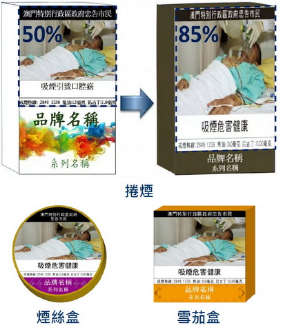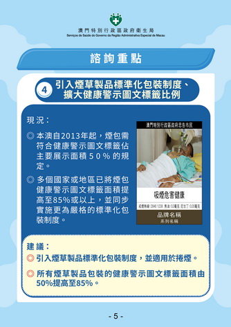 為減低煙草包裝對吸煙者特別是年輕人士的吸引力,建議引入煙草製品標準化包裝制度,以標準顏色和字體顯示品牌及系列等名稱,並擴大健康警示圖文標籤在包裝上的比例,由現時的50%提高至85%,並設立一年寬限期。