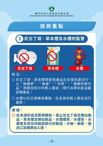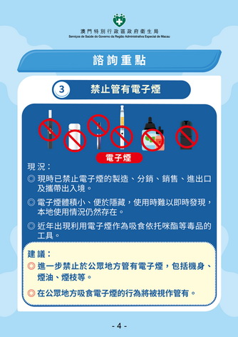 林松指出,雖然特區政府已禁止電子煙的製造、分銷、銷售、進出口及攜帶出入境超過三年,理論上相關產品應已消耗完畢,但社會上仍不時發現吸食或偷運的情況;為進一步加強管控,政府建議禁止在公眾地方管有電子煙,鄰埠香港也將於今年四月底起實施在公眾地方禁止管有電子煙,當局希望法案能於2027年生效。同時修法建議禁止尼古丁袋、草本煙及包括水煙煙草/水煙膏和水煙壺等水煙的製造和流通,防止青少年接觸新興煙草產品。