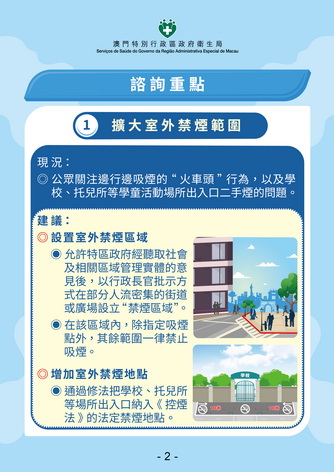 防控煙酒辦公室主任林松逐一介紹五項修法重點,包括針對邊行邊吸煙帶來的二手煙問題,政府建議擴大室外禁煙範圍,將學校、托兒所等場所出入口列為法定禁煙地點,並允許政府在聽取社會意見後在部分人流密集的街道、廣場設立「禁煙區域」。當局已在宋玉生公園周邊街道設立禁煙區試點,並設置了九個指定吸煙點,他提到不同國家或地區的指定吸煙點的設置有所不同,目前本澳設置的吸煙點為無遮擋,當局未來將會選定其中一個吸煙點改為有遮擋的方式。