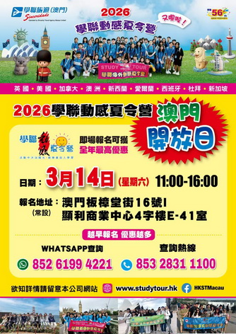 為幫助家長和同學們深入了解2026年學聯動感夏令營的遊學課程及詳細安排,學聯旅遊於3月14上午11時至下午四時,將於板樟堂街16號顯利商業中心四字樓E-41室舉行「學聯動感夏令營開放日」,幫助有興趣的家長和孩子選擇心儀課程並盡早報名。