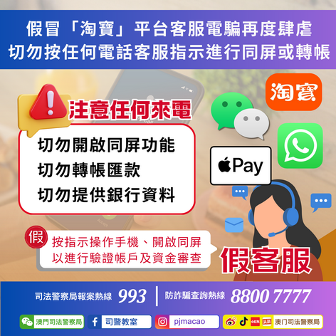 司警局反詐騙協調中心提醒全澳市民淘寶及支付寶的「資金/支付安全保障」屬平台提供的免費服務且無需續期,倘接到自稱淘寶、支付寶或其他平台客服人員的電話聲稱涉及保費到期,必定為詐騙,應立刻掛線;不論接到自稱任何機構的客服來電,切勿按對方指示進行同屏操作、透露任何個人銀行訊息,更不可進行任何銀行交易操作;如對來電者身份存疑時,應透過有關機構的官方聯絡途徑自行致電求證;如有懷疑,應使用司警局「反詐程式」查核詐騙風險指數,又或致電司警局防詐騙查詢熱線88007777或報案熱線993求助。
