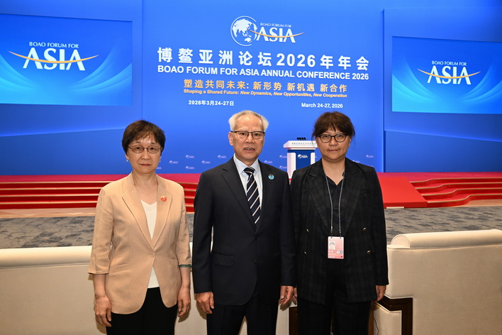 【本報消息】行政長官岑浩輝26日上午出席博鰲亞洲論壇2026年年會全體大會,聆聽中共中央政治局常委、全國人大常委會委員長趙樂際發表的主旨演講。在博鰲期間,岑浩輝也於25晚與海南省委書記、省人大常委會主任馮飛及海南省省長劉小明會面,雙方就高質量推進澳瓊合作,共同助力國家進一步對外開放等議題交流意見。