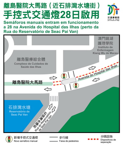【本報消息】經綜合分析離島醫療綜合體周邊道路的交通條件以及平衡行人和駕駛者的需要,保障人車通行安全,交通事務局於離島醫院大馬路近石排灣水塘街交界處,增設分段手控式交通燈設備,以優化行人往返離島醫療綜合體及石排灣住宅群的過路條件,相關設施將於本月28 日上午啟用。