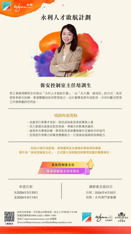 有意參加者可於3月30日至4月14日期間透過登入勞工局網站遞交申請。申請期結束後,永利將通知符合條件的申請人出席4月20日舉行的講座並隨即安排面試,屆時將詳細說明計劃的各項培訓內容及職業生涯發展路徑。如有查詢,可登入勞工局網站內相關專頁了解計劃詳情,亦可於辦公時間內致電勞工局就業廳關先生(電話:8399 9856)或永利招聘熱線(電話:8986 6222)。