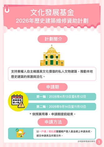 【本報消息】文化發展基金推出2026年「歷史建築維修資助計劃」,支持業權人自主維護具文化價值的私人文物建築,推動本地歷史建築的保護與活化。