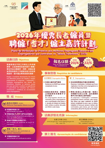 【本報消息】為表揚長者在不同工作崗位上的卓越表現,及對聘用長者僱員的商戶、機構或單位作出公開嘉許,藉以促進社會各界對長者就業能力的認同,為長者提供更多的就業機會。由勞工事務局與社會工作局合辦、社會保障基金協辦的2026年優秀長者僱員暨聘僱「耆才」僱主嘉許計劃由4月20日至5月22日接受提名。