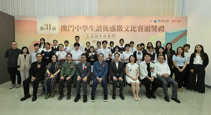 【本報消息】由澳門基金會與澳門日報合辦的第31屆「澳門中學生讀後感徵文比賽」反應熱烈,本屆以「古詩詞中的澳門」為主題,共收到27間學校439份參賽作品。頒獎禮於上周六在澳門教科文中心舉行,主辦單位向20位獲獎學生頒發獎座,以示鼓勵。