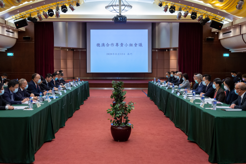 【本報消息】2020年穗澳合作專責小組會議在澳門世界貿易中心蓮花廳舉行,澳方組長、經濟財政司司長李偉農及穗方組長、廣州市人民政府副市長胡洪分別率領代表團出席會議。