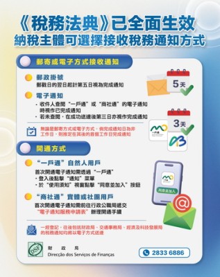 【本報消息】為配合特區政府的電子政務發展,《稅務法典》新增以電子方式接收稅務行政當局的稅務通知,納稅主體除了可以郵寄方式接收稅務通知外,還可選擇透過一戶通或商社通以電子方式接收稅務通知。郵政掛號通知推定以郵戳日的翌日起計第五日視為完成通知;電子通知則以收件人查閱一戶通或商社通的電子通知時視作已完成通知,若未查閱,推定在成功送達後的第三日亦視作完成通知。無論是以郵寄方式或電子方式接收稅務通知,倘完成...