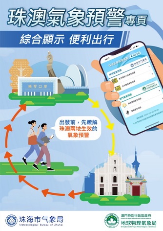 【本報消息】為促進橫琴粵澳深度合作區的氣象服務,本澳氣象局與珠海市氣象局聯合推出「珠澳氣象預警」專頁,同時當澳門暴雨警告信號、熱帶氣旋信號或風暴潮警告生效時,珠海市七個重要口岸和交通樞紐共15處電子屏將顯示澳門預警信息,以期進一步便利跨境市民和旅客瞭解珠澳兩地的氣象預警資訊,從而更好地規劃行程及做好應對措施。「珠澳氣象預警」專頁實現珠澳兩地氣象信息的實時共享,並全面覆蓋暴雨、熱帶氣旋等惡劣天氣的預...