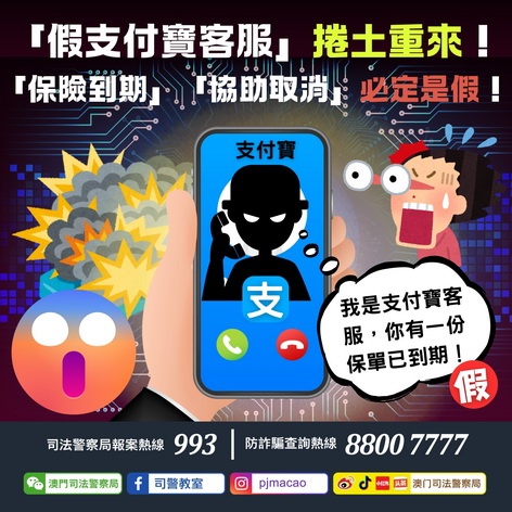 【本報消息】司法警察局5月12日透過反詐程式及防詐騙查詢熱線,分別接獲至少36名市民舉報,報稱收到冒充「支付寶」客服的詐騙電話。騙徒在來電中聲稱事主支付寶內的「資金安全保」即將到期,若不取消將被收取高額費用。隨後,騙徒再冒充其他金融機構的「客服」聯絡事主,訛稱協助取消保險手續,趁機詐騙金錢。所幸上述事主曾聽取本局的防騙資訊,因此未造成財產損失。然而,同日仍有四名事主因誤信騙徒,與對方進行視頻通話...