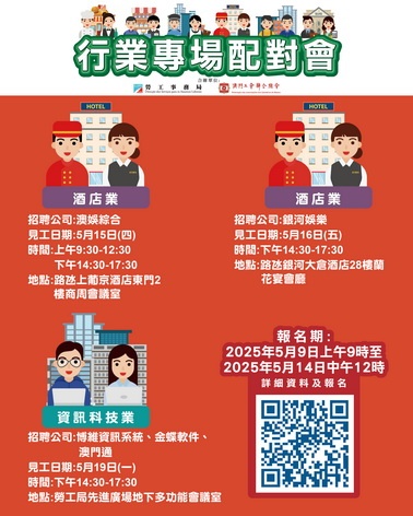 【本報消息】為協助有求職需求的澳門居民盡快就業,以及為緩解業界的人資需求壓力,勞工局與工聯合作於五月中旬舉辦三場行業專場配對會,合共提供61個空缺。5月15日全日舉辦「澳娛綜合度假股份有限公司」專場配對會,提供16個職位空缺,涉及銷售經理(會展/商務/宴會/休閒旅遊)、貴賓服務主任、餐飲主任、前台服務員及禮賓服務員等。16日下午舉辦「新銀河娛樂2006有限公司」專場配對會,提供25個職位空缺,涉...