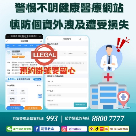 【本報消息】司警局近日接獲通報,指有內地健康網站未經許可擅自盜用本澳多家醫院名稱及醫生資訊,假冒線上預約掛號界面,要求使用者填寫姓名、手機號碼等個人資料進行預約掛號。衛生局及有關醫院已澄清,強調從未授權該網站提供預約掛號等相關服務。經調查,不排除該網站涉嫌假借本澳醫院名義,非法收集使用者的個人資料作不法用途。司警局反詐騙協調中心特此呼籲市民,預約醫療服務時,應直接聯繫相關醫療機構,或通過其官方途...