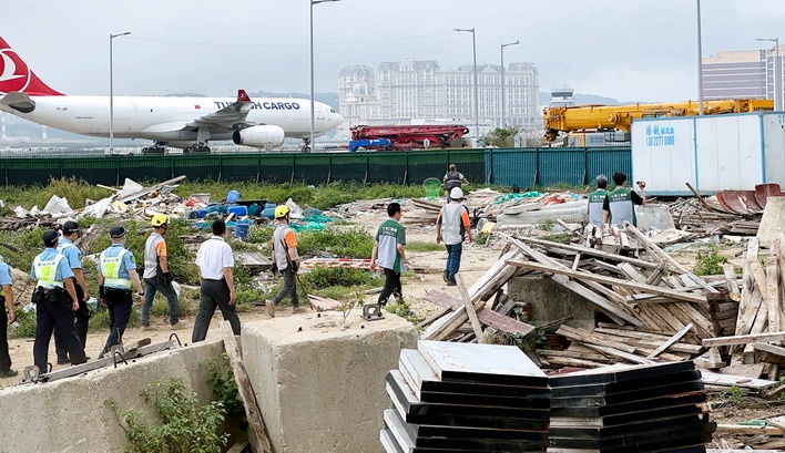 【本報消息】特區政府4月23日展開跨部門聯合清遷行動,收回氹仔新城填海E2區機庫路一幅約13,515平方米被佔用的國有土地。是次行動收回的土地現場堆放了竹棚、工具、金屬支架、建築機械,並被用作放置貨櫃及停泊車輛等。土地工務局早前展開騰空土地程序,要求佔用人於期限內騰空並將土地歸還予特區政府。鑑於清遷期限屆滿,上述土地仍未被完全騰空及交還,特區政府遂採取聯合行動,騰空及收回上述土地。