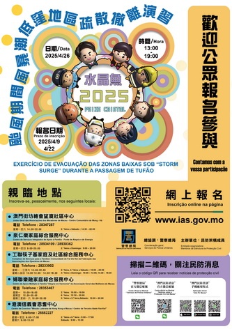 【本報消息】為持續強化本澳防災減災的應急聯動效能,提升公眾對自然災害的防範意識,民防架構將於4月26日舉行代號「水晶魚2025」民防演習。屆時,將模擬執行「颱風期間風暴潮低窪地區疏散撤離專項應變計劃」,並邀請市民共同參與實地演練,以加深市民對疏散撤離流程和路線的認識,強化協作精神。歡迎市民積極參與。是次演習還將模擬多項颱風期間可能發生的意外事故情況,並進行專項演練,旨在測試民防架構的應急協調與聯...