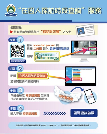 【本報消息】為配合特區政府電子政務的發展,持續優化各項便民服務,懲教管理局自3月31日起,於網上服務平台新增在囚人探訪時段之查詢。持有探訪許可證之人士,可登入懲教局路環監獄網上申請服務(www.dsc.gov.mo/site/web_opinion.aspx),按提示輸入及提供相關資料,查詢相關在囚人探訪時段。市民如有任何查詢,可於辦公時間致電(853)28881211,與路環監獄社工或心理輔導...