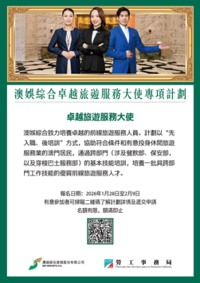 【本報消息】為應對澳門旅遊業發展需要,以及節假日期間有大量的旅客接待工作,勞工事務局和澳娛綜合合作推出「澳娛綜合卓越旅遊服務大使專項計劃」,以先入職、後培訓方式培養一批具跨部門工作技能的前線旅遊服務人員。計劃提供卓越旅遊服務大使職缺30個。獲錄取參加者,首八個月將安排接受餐飲部培訓及工作實踐。倘僱員有意在餐飲部發展,將繼續培訓至第24個月並通過評核,可晉升為餐飲部部長,薪酬將獲調升並可按職程發展...