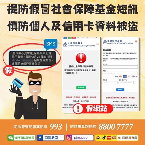 【本報消息】司法警察局接獲社會保障基金檢舉,指有人冒充社會保障基金發出釣魚短訊,內容聲稱「社保帳戶」未上傳電子審查,要求市民點擊短訊內附帶的連結,否則將註銷帳戶。社保基金澄清並沒有發出有關社保帳戶電子審查的短訊,該則短訊以「社保中心」名義發出,內容提及需要點擊附帶連結以辦理帳戶電子審查,否則帳戶會被取消。居民點撃連結後會跳轉到一個與「社會保障基金」介面極為相似的釣魚網站,畫面會要求市民輸入姓名及證...