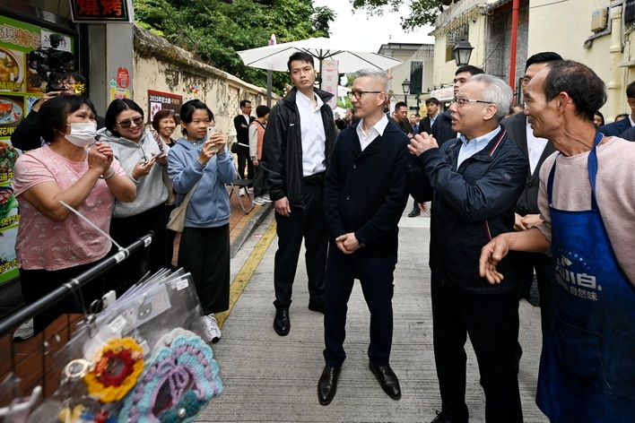 【本報消息】行政長官岑浩輝於大年初四(2月1日)走訪社區,實地了解節日期間商戶營運及市面情況,期間不時與途人、店主和店員互致新春祝福,氣氛熱鬧和諧。他表示特區政府將在廣納意見及充分掌握實況的基礎上,致力做好發展經濟與改善民生的各項工作,持續優化營商環境,讓更多居民和企業分享到經濟發展成果。岑浩輝當日在經濟財政司司長戴建業陪同下,首先到達關前街、果欄街、十月初五街、康公廟前地一帶視察,沿途聽取經濟財...