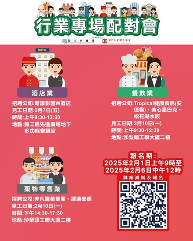 【本報消息】為協助有求職需求的澳門居民盡快就業,以及為緩解業界的人資需求壓力,勞工局與工聯合作於二月上旬舉辦三場行業專場配對會,合共提供136個空缺。2月7日上午舉辦「澳門新濠影滙W酒店」專場配對會,提供17個職位空缺,涉及迎賓專員、客戶聯絡中心專員、樓宇服務技工、倉庫管理員及初級廚師等。2月10日上午舉辦餐飲業專場配對會,參與企業有「Tropical 健康食品有限公司(安德魯)」、「美心星巴克...
