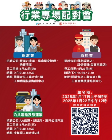 【本報消息】為協助有求職需求的澳門居民盡快就業,以及為緩解業界的人資需求壓力,勞工局與工聯合作在本月下旬舉辦三場行業專場配對會,合共提供207個空缺。1月23日上午舉辦保潔業配對會,招聘公司是「寶潔力清潔管理有限公司」、「昆侖保安管理有限公司」及「怡寶清潔服務有限公司」,三間公司合共提供139個職位空缺,涉及接待員、保安員、管理員、清潔員及洗碗員等。下午舉辦酒店業配對會,招聘公司是「澳門羅斯福酒...