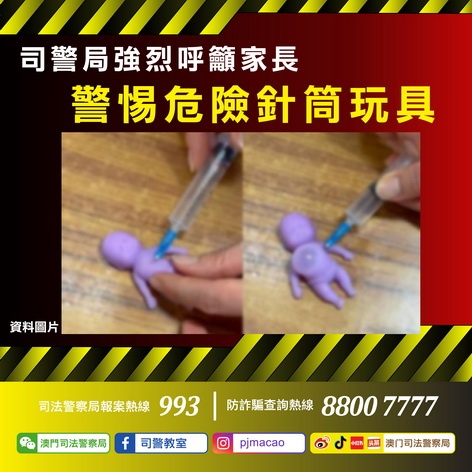 【本報消息】近日,司警局接獲市民反映指有鄰近地區網上平台及玩具店出售一款針筒玩具(或稱「捏捏樂」、「擠痘痘」等),讓購買者利用針筒將液體或空氣注射到矽膠玩偶內,使其膨起水泡或氣泡,再將之捏破。由於有關針頭非常鋒利,針尖與一般醫療針頭相似,倘若青少年將之視作玩具,譬如模仿醫護人員,將空氣或不明液體注入自己或他人身體內,可造成身體嚴重損傷,甚至引致死亡。司警局在此強烈呼籲家長為子女選購玩具時務必考慮...