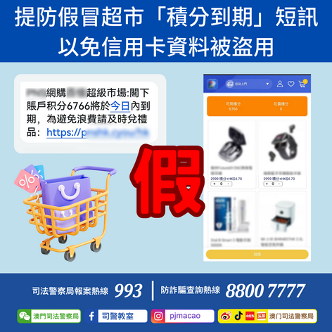 【本報消息】司警局於10月20日發現有騙徒假冒港澳大型連鎖超市向市民隨機發送釣魚短訊,訛稱市民帳戶積分即將到期,要求市民點擊短訊內附帶之連結進入一個假冒該超市的網站,誘騙市民輸入個人資料及信用卡資料以低價加積分換取禮品,藉此盜取市民的信用卡資料以進行非授權之大額交易。司警局反詐騙協調中心提醒市民,不論發短訊者是誰,若收到宣稱「積分即將到期」的短訊,應主動向相關機構查詢,或利用官方的應用程式操作,切...
