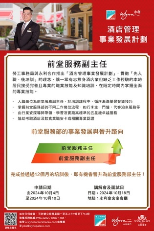 【本報消息】為培育本地人才並提供發展階梯,勞工事務局與永利澳門合作推出「酒店管理事業發展計劃」,以「先入職、後培訓」方式,為有志投身綜合休閒旅遊服務行業的澳門居民提供全方位培訓及發展階梯,計劃由10月4日起接受申請。計劃提供「前台接待員」職缺12個、「前堂服務副主任」職缺五個及「客房部副主任」職缺五個,合共22個職缺。獲錄取參加計劃者,永利將安排一系列專業培訓及工作實踐,培訓內容包括相關部門的實務...