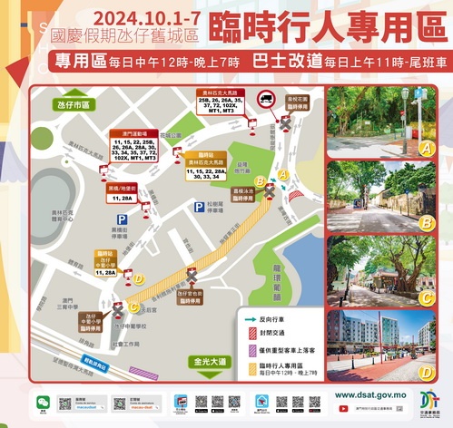 【本報消息】配合氹仔舊城區於國慶節期間設立臨時行人專用區,經收集氹仔居民、社團及商會意見及參考過往經驗成效,活動期間區內將實施臨時交通管制及公共巴士分流方案。根據安排,10月1日至7日期間的每日中午12時至晚上7時,氹仔飛能便度街部份路段、施督憲正街、告利雅施利華街及周邊道路臨時封閉安排,車輛可取道奧林匹克大馬路前往黑橋街及地堡街一帶;近飛能便度街的一段素啤古街實施反方向行車,以保持區內交通循環;...