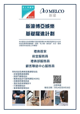 【本報消息】為培育本地人才並提供發展階梯,勞工事務局和新濠合作推出「新濠博亞娛樂基礎躍進計劃—酒店營運」,以「先入職、後培訓」方式,為有志投身綜合休閒旅遊服務行業的澳門居民提供全方位培訓及發展階梯,計劃由9月24日起接受申請。計劃提供前台服務員職缺12個、顧客聯絡中心服務員職缺三個、禮賓部服務員職缺五個及禮賓管家職缺八個,合共28個職缺。獲錄取參加計劃者,新濠將安排一系列專業培訓及工作實踐,培訓內...