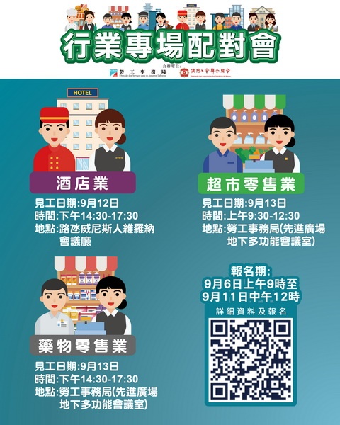 【本報消息】勞工事務局與工聯繼續合作於下周舉辦三場行業專場配對會,合共提供274個空缺。9月12日下午舉辦酒店業配對會,提供122個職位空缺,涉及餐飲服務經理、餐飲服務主管、主廚、管事主任、廚師及餐飲服務員等。9月13日上午舉辦超市零售業配對會,提供100個職位空缺,涉及店務員、理貨員、收銀員、肉類處理員、蔬果包裝員及送貨雜務員等。下午舉辦藥物零售業配對會,提供52個職位空缺,涉及藥劑師及售貨員...