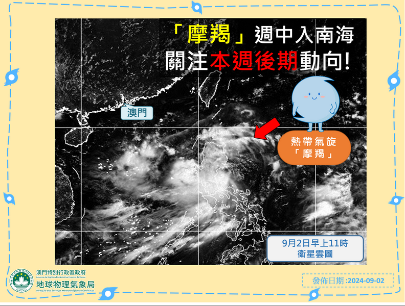 【本報消息】全澳八成的莘莘學子在酷熱天氣下開學,然而,熱帶氣旋可能緊隨開學日而來,位於菲律賓以東的熱帶低壓已經加強成為熱帶氣旋「摩羯」,氣象局預料其將於周二下午至晚間進入本澳800公里範圍,屆時氣象局會發出一號風球;按照現時預測,「摩羯」將於本周後期進一步移近華南沿岸,暫不排除會於本澳以南約300公里範圍內掠過。另外,鄰埠香港天文台也發出「特別天氣提示」,指考慮在9 月 3 日下午至晚上發出一號戒...