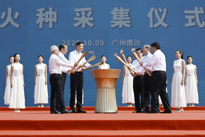 【本報消息】第15屆全國運動會和全國第12屆殘疾人運動會暨第九屆特殊奧林匹克運動會火種採集儀式,周四上午10時在廣州南沙科考碼頭舉行。行政長官岑浩輝赴穗出席了火種採集儀式火種採集儀式10月9日上午在中國自主設計建造的首艘大洋鑽探船「夢想號」的見證下在廣州南沙舉行。儀式上,火種護衛隊將「源火」盒安放至「源火」台,採火少女在「源火」台引燃手中的採火棒,中共中央政治局委員、廣東省委書記黃坤明,15運會...