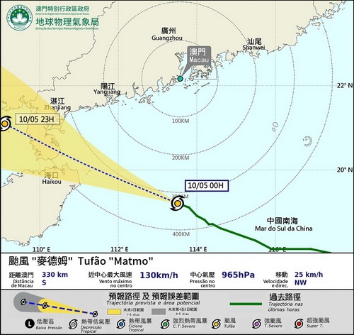 【本報消息】氣象局表示,受強烈熱帶風暴「麥德姆」影響,該局將今日(5日)凌晨二時發出八號東南風球,預測本澳風力將會增強。氣象局指颱風「麥德姆」正以較快速度橫過南海中北部,大致趨向雷州半島至海南島一帶。現時本澳風勢正持續增強,間中有大驟雨。於凌晨零時,颱風「麥德姆」正集結在澳門以南約330公里處(約北緯19.2度,東經113.5度),以時速約25公里向西北方向移動,大致趨向雷州半島至海南島一帶及增強...