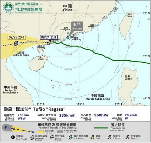 【本報消息】氣象局於凌晨五時半發出10號風球,預料將維持一段時間。紅色風暴潮警告仍然生效,清晨至早上改發黑色風暴潮警告的機會維持中等。於早上七時,超強颱風「樺加沙」正集結在本澳東南偏南約120公里處(約北緯21.2度,東經114度),以時速約20公里向西北偏西方向移動,大致趨向珠江口西岸。氣象局又呼籲,由於超強颱風「樺加沙」將會對本澳造成顯著的影響,帶來與「天鴿」、「山竹」相若的嚴重威脅。受風暴...