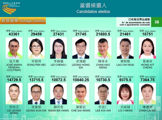 【本報消息】第八屆立法會選舉的投票程序經已完結,其中,直接選舉共有175,272位選民投票,投票率53.35%,間接選舉共有6,645位選民投票,投票率88.12%。初步點票工作在周一凌晨零時50分完成。根據選舉管理委員會公佈,直選方面各候選名單得票如下:《第1組》澳門民聯協進會共得到29,459票、《第2組》新希望共得到43,361票、《第3組》群力促進會共得到21,745票、《第4組》澳粵同...