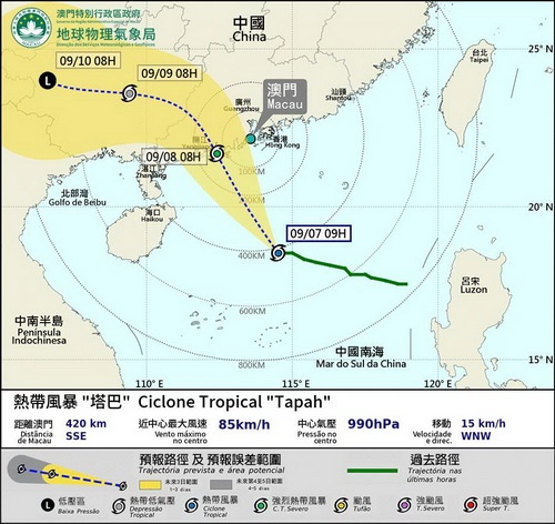 【本報消息】受熱帶風暴「塔巴」影響,氣象局於早上八時改發三號風球,並預測在晚上八時至11時改發八號風球可能性高,下午至傍晚發出黃色風暴潮警告機會亦中等至較高。截至下午三時,「塔巴」正集結在澳門南約340公里處(約北緯 19.1 度,東經 114.0 度),以時速約18公里向西北方向移動,大致趨向廣東西岸。大致趨向廣東西岸。未來一兩日將採取北至西北方向移動,並逐漸加強,大致趨向廣東西岸。氣象局指位於...