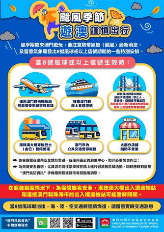 【本報消息】地球物理氣象局已發出三號風球。受熱帶氣旋影響,澳門風力將會增強,旅遊局建議旅客密切留意地球物理氣象局網站(www.smg.gov.mo/zh)及新聞局網站(www.gcs.gov.mo),以獲取最新資訊。旅遊局各旅客詢問處已於當眼位置展示颱風資訊,並透過電訊公司向在澳門旅客及在外地旅遊的澳門居民發放民防相關資訊;旅遊局網頁及社交平台亦有轉載氣象相關資訊。旅遊熱線(2833 3000)...