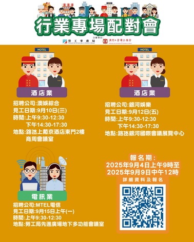 【本報消息】勞工局與工聯繼續合作於本月中旬舉辦三場行業專場配對會,合共提供87個空缺。9月10日全日舉辦「澳娛綜合度假股份有限公司」專場配對會,提供12個職位空缺,涉及前台主任、禮賓主任、管家部主任、娛樂視聽主任及娛樂視聽技術員等。9月12日全日舉辦「新銀河娛樂2006有限公司」專場配對會,提供61個職位空缺,涉及餐飲助理經理、副總廚(日本餐/西餐)、餐飲主任、環境衛生主任、調酒員、前臺服務員、管...