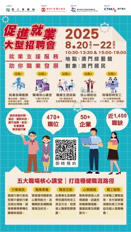 【本報消息】為全力促進各階層求職者對接就業及助力居民向上流動,由勞工事務局主辦、工聯承辦的「促進就業大型招聘會」將於8月20日至22日假澳門綜藝館舉行,由即日起至8月18日期間接受網上報名。是次招聘會逾50間企業參與招聘,涵蓋綜合休閒旅遊、酒店、資訊科技、銀行金融、社會服務、電訊服務、航空等多個行業,涉及470多個職位近1,400個職缺。職位涵蓋:客戶經理、業務經理、資訊科技類工程師、機電組長、...