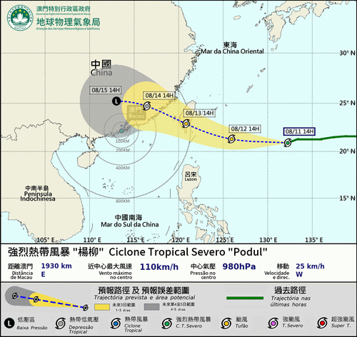 【本報消息】本澳氣象局預料,位於台灣東面海域的強烈熱帶風暴「楊柳」周三下午會進入本澳800公里範圍,屆時強度將增強至颱風級別,隨後橫過台灣南部,周四會在本澳400公里範圍外登陸中國東南沿海;預測本澳周二至周三天氣仍然酷熱,高溫可達攝氏約34度,當局已發出黃色高溫提示,本周後期雷驟雨增多,但「楊柳」由生成至今的路徑及發展存在較大不確定性,若「楊柳」採取較接近廣東東部沿岸的路徑,本澳風...