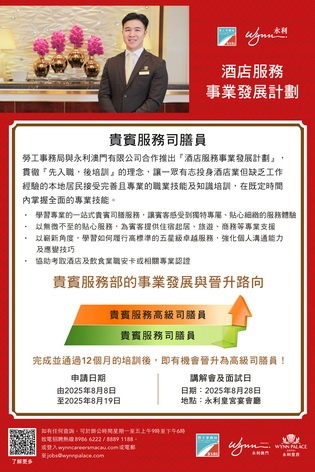 【本報消息】為培育本地人才,提供職業發展機會,勞工事務局和永利澳門合作推出「永利酒店服務事業發展計劃」,以「先入職、後培訓」方式為有志投身酒店服務範疇的澳門居民,提供一系列的專業培訓及工作實踐,計劃由8月8日起接受申請。計劃提供前堂接待員職缺八個及貴賓服務司膳員職缺六個,合共14個職缺。獲錄取參加計劃者,永利將安排12個月的專業培訓及工作實踐。培訓內容包括酒店信息管理系統培訓、前堂部或貴賓服務部實...