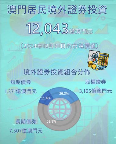 【本報消息】金融管理局發佈的統計顯示,截至2024年12月31日澳門居民(包括個人、政府及其他法人,但不含澳門特別行政區的外匯儲備)持有由境外無關連實體發行的證券投資,以當天市場價值計算為12,043億澳門元,較2024年6月30日及2023年底分別上升2.7%和14.3%。在各類證券投資中,股權證券(包括互惠基金與投資信託單位)、長期債券及短期債券的市值分別為3,165億元、7,507億元及1,...