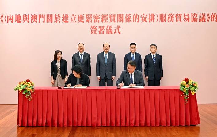 【本報消息】國家商務部國際貿易談判副代表李詠箑(副部長級)與經濟財政司司長李偉農於本月10日在澳簽署《關於修訂〈CEPA服務貿易協議〉的協議二》(《修訂協議二》),行政長官賀一誠及中聯辦主任鄭新聰見證簽署。《修訂協議二》自簽署日起生效,將於2025年3月1日起正式實施。今年是澳門回歸祖國25周年,《修訂協議二》的簽署具有重要的意義,有助進一步深化兩地經貿交流合作,加快推動粵港澳大灣區建設,以及促進...