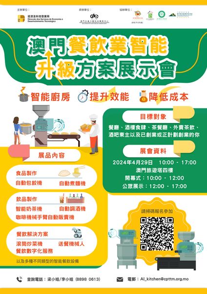 【本報消息】由經濟及科技發展局主辦、澳門生產力暨科技轉移中心承辦的澳門餐飲業智能升級方案展示會將於4月29日假澳門旅遊塔四樓展廳舉行。展示會報名情況踴躍,至今已有過百名業界代表報名參加。展示會將聚焦展示新一代智能化餐飲設備,為本澳餐飲業界帶來技術創新、降本增效、客戶體驗優化和商業合作機會。歡迎業界及公眾到場參觀。特區政府一向致力支持澳門中小企利用科技提升營運效率,近年積極開展包括專題講座、培訓課...